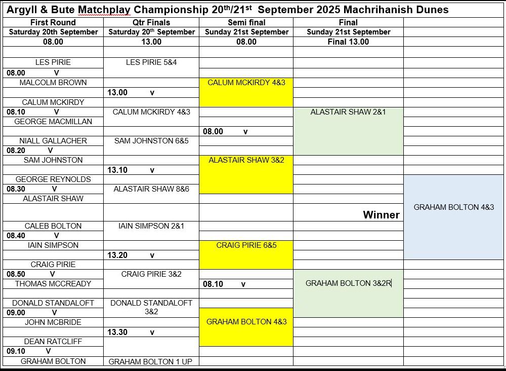 Rothesay’s Graham Bolton won his 11th Matchplay title at a breezy Machrihanish Dunes after beating clubmate Ally Shaw by 4&3, Graham got off to a flyer after losing the first to turn in 4up, he hung on despite a couple of birdies at 11 & 13 from Ally to momentarily narrow the deficit but a birdie from Graham at the 14th allowed him to resume command.