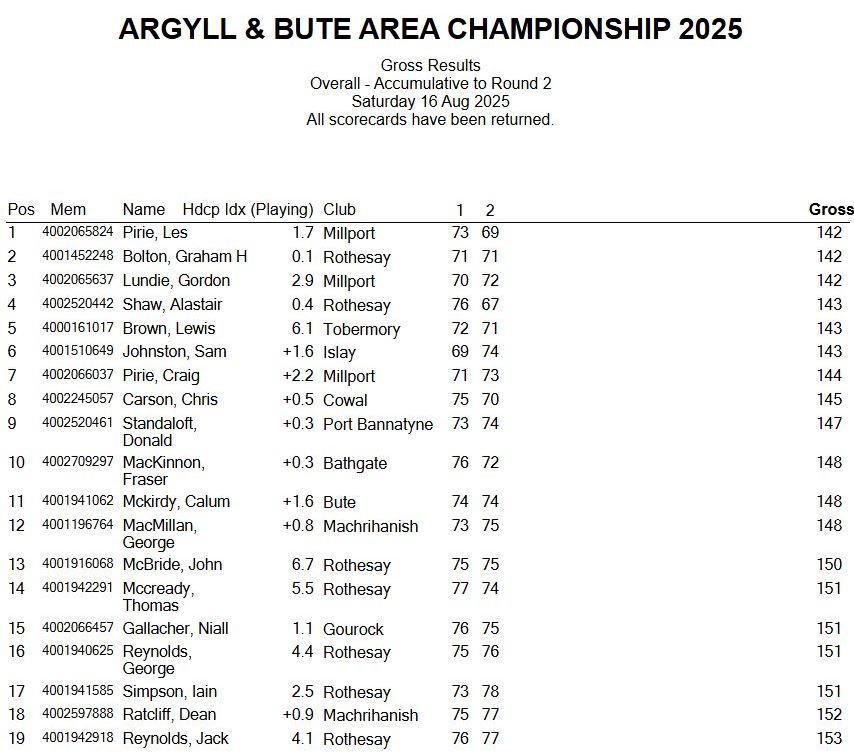 Locals Les Pirie and Gordon Lundie tied with Rothesay's Graham Bolton and an 18 hole play off will take place at a later date. Tied in joint 4th with 143 were Ally Shaw, morning leader Sam Johnston and Lewis Brown. Last year's winner Craig Pirie was next with 144 with Chris Carson next on 145.