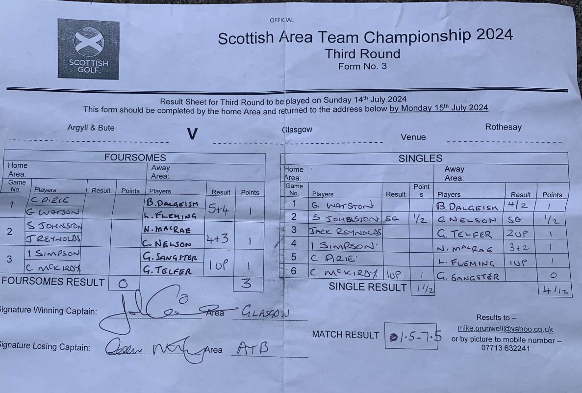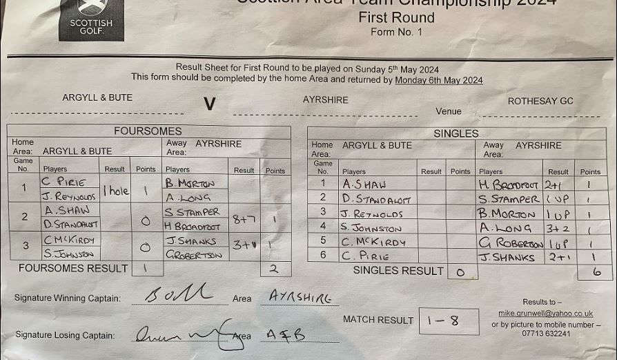 The area would like to thank Rothesay for staging the event and commend them and their greenkeeper for the course’s stunning condition despite some heavy overnight rain.