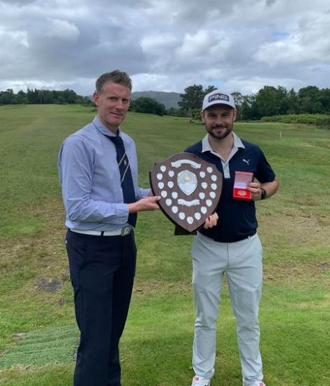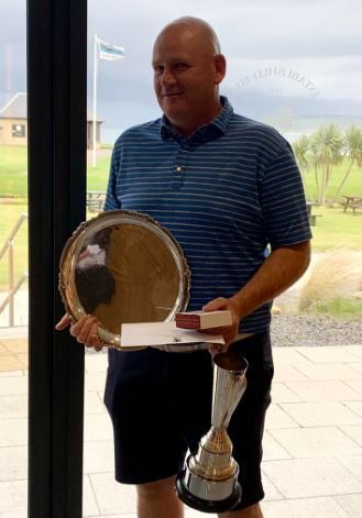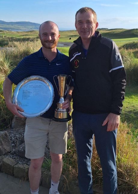 Winner Ally Shaw with the matchplay trophy presented by Area secretary Graham Bolton at Machrihanish Dunes on Sunday 19th September