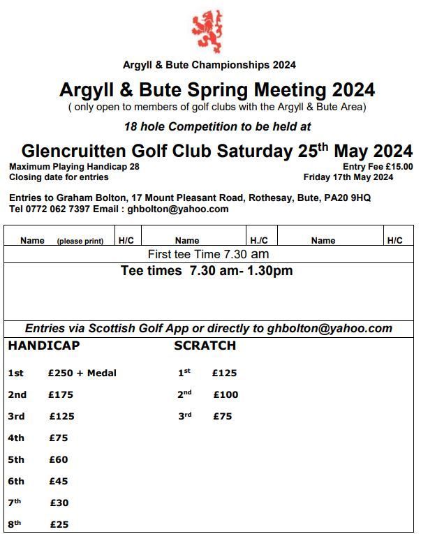 Entries can be made via the Scottish Golf App or via e-mail /or text to the Area Secretary Graham Bolton on ghbolton@yahoo.com /07720627397.